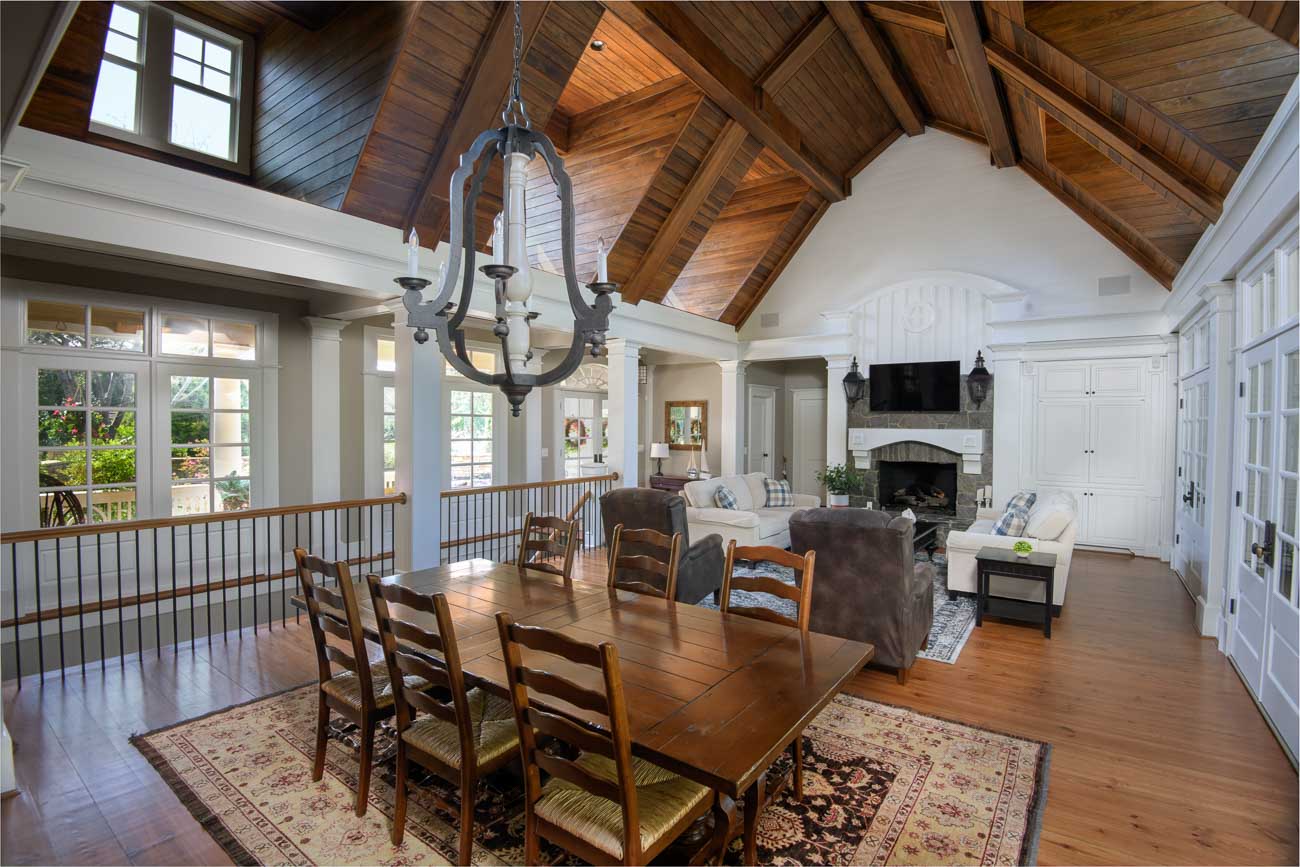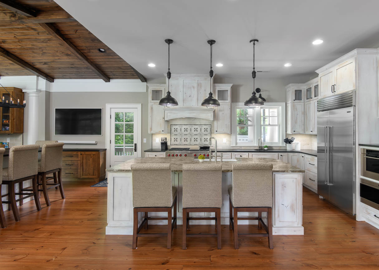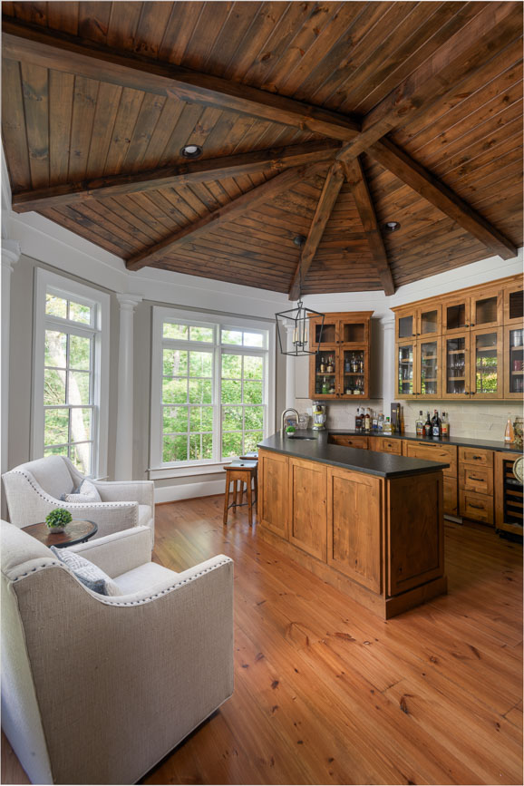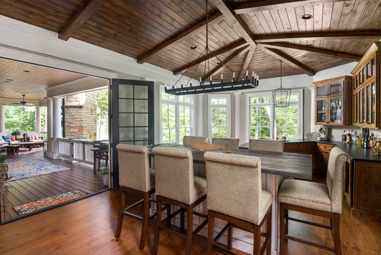 We made this small, dated kitchen into a big, spacious area with a full bar and seating area. With custom posts and beams, and complete with wood ceilings. We completed the whole home interior painting and staining to bring this home up to date.