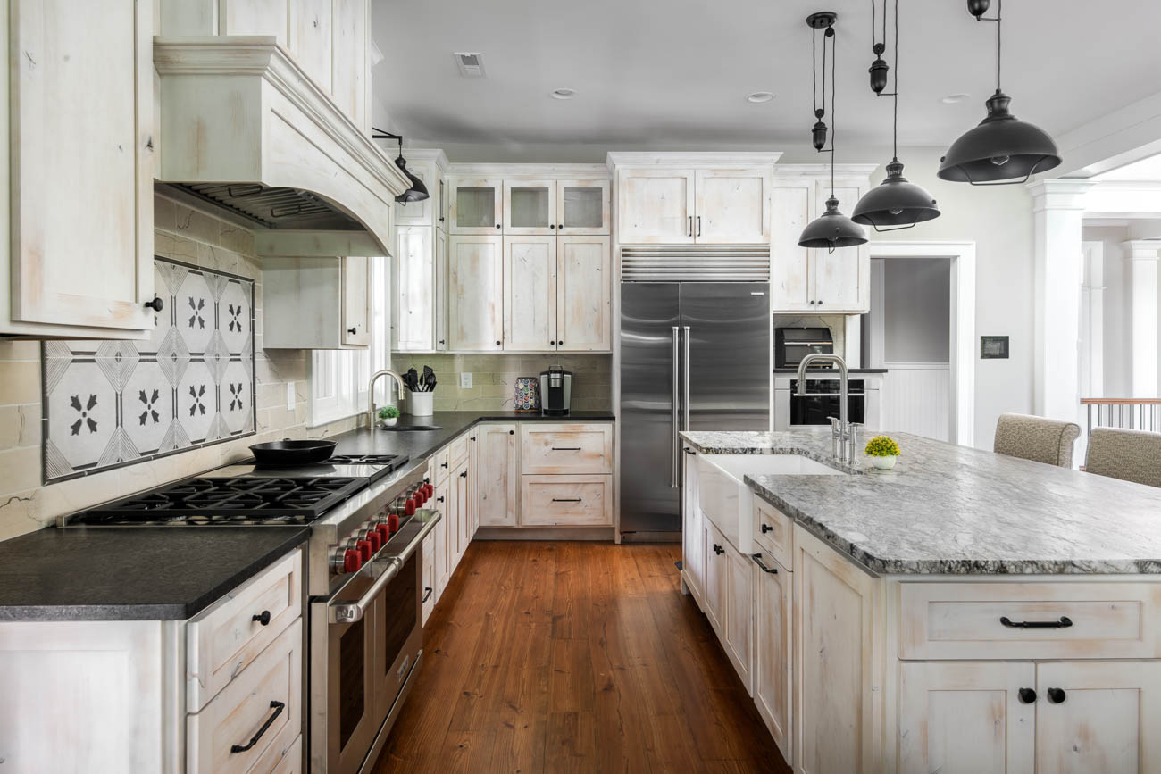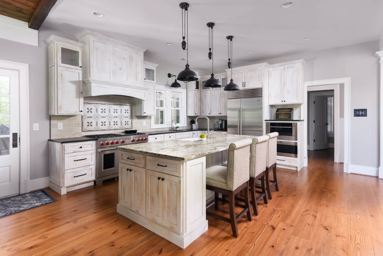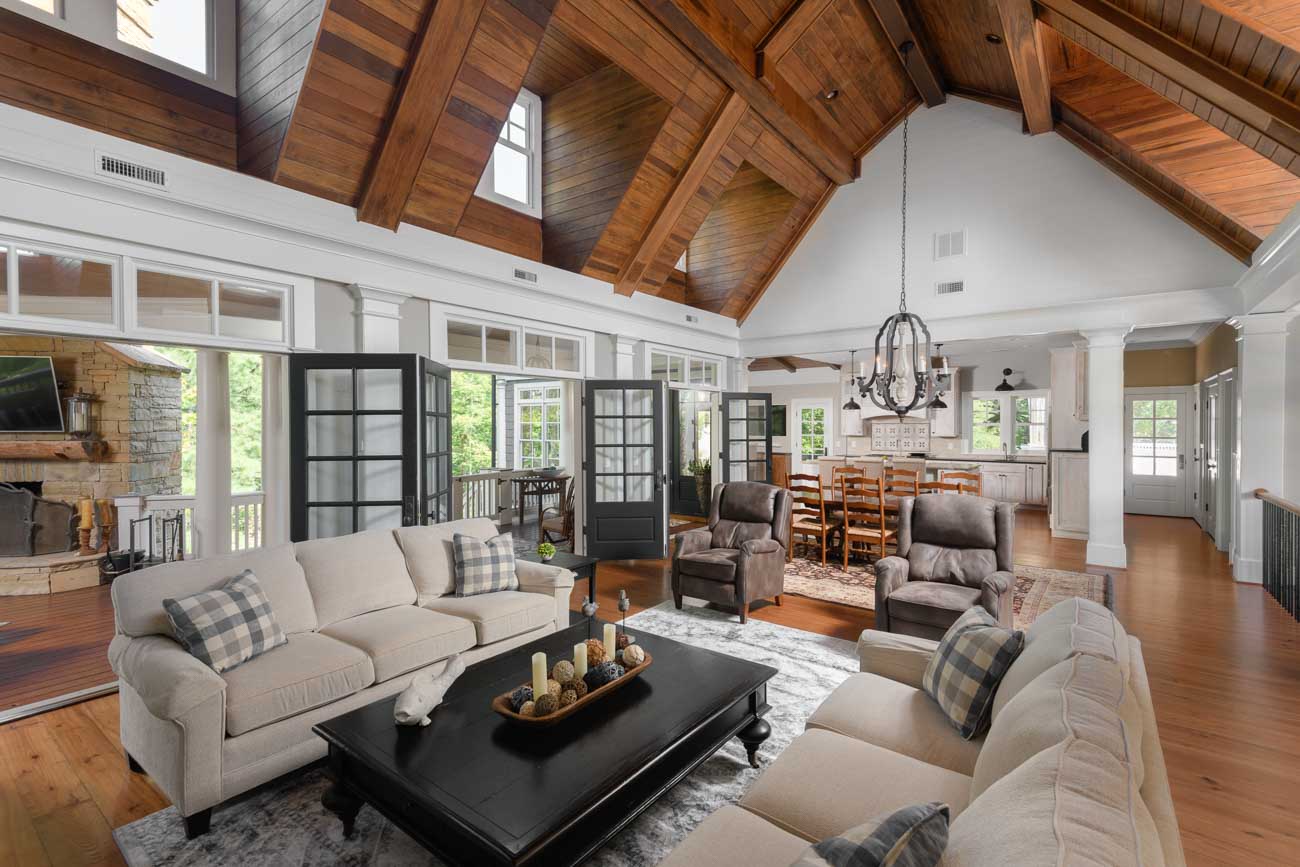 We made this small, dated kitchen into a big, spacious area with a full bar and seating area. With custom posts and beams, and complete with wood ceilings. We completed the whole home interior painting and staining to bring this home up to date.